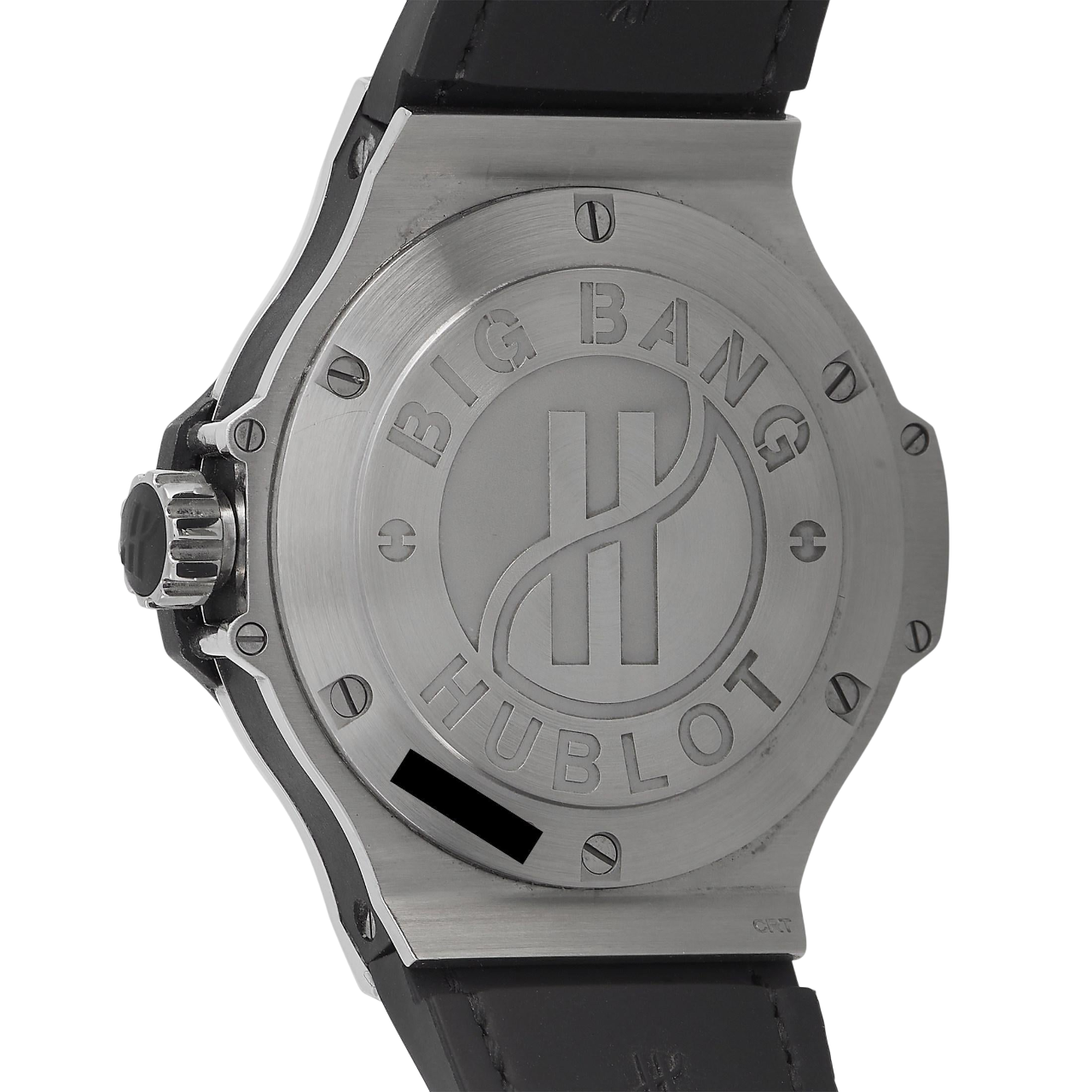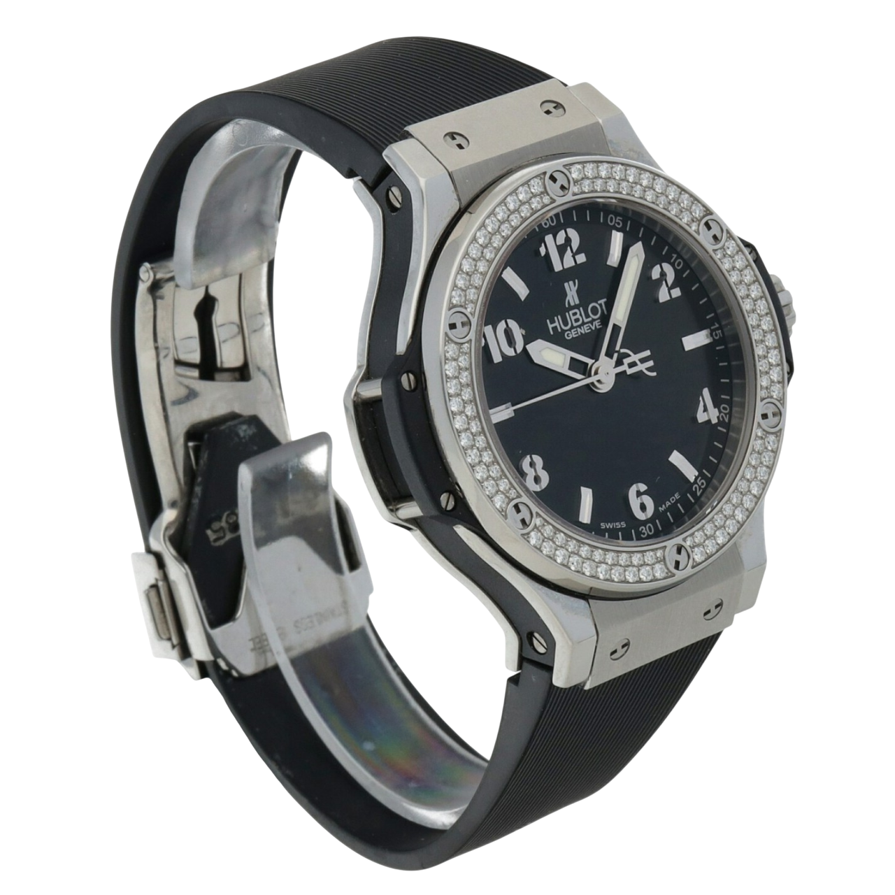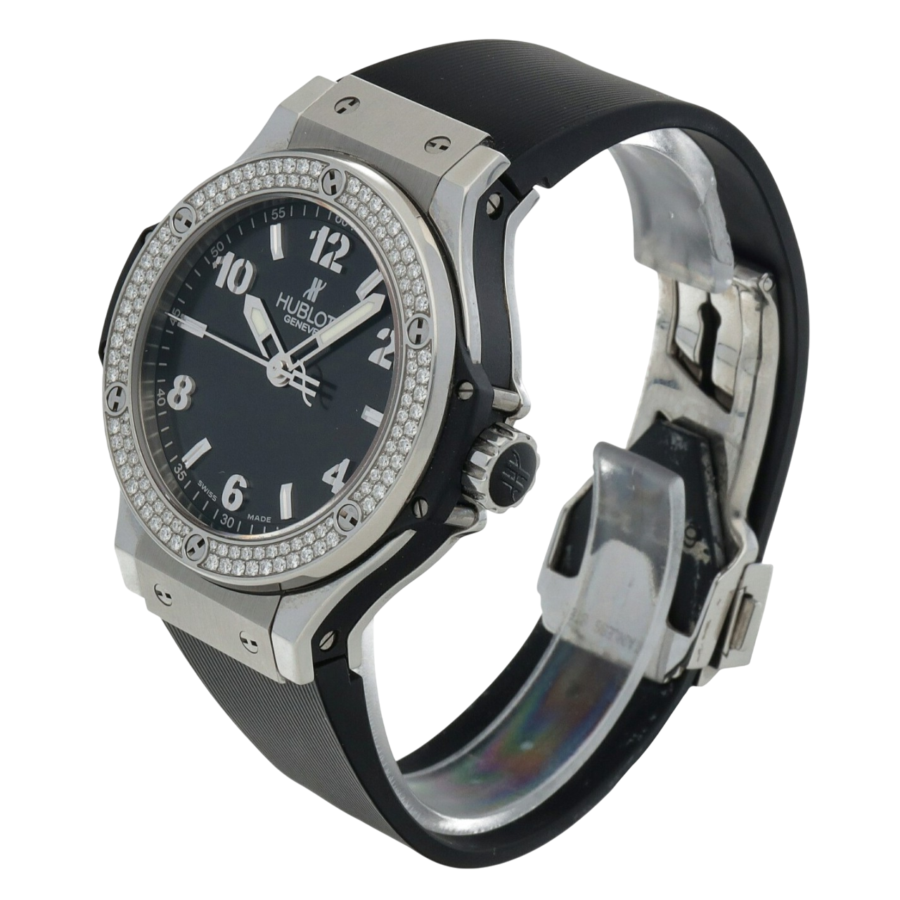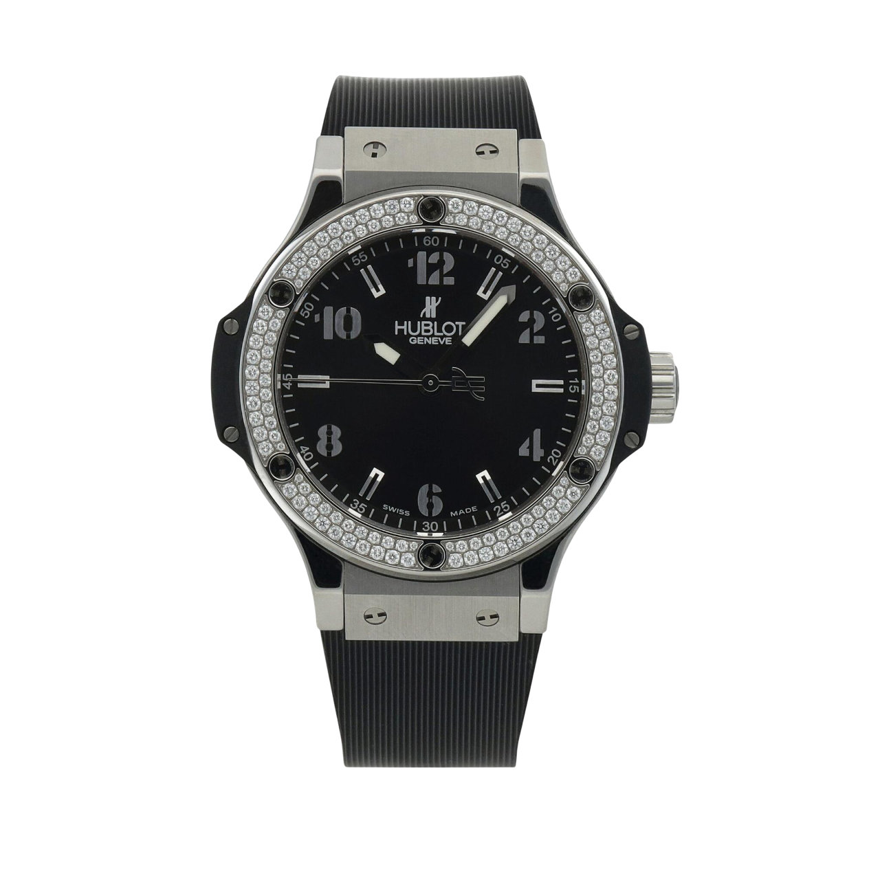 A 38mm Hublot Big Bang with a stainless steel case, diamond-set bezel, black dial, quartz movement, and black rubber strap.