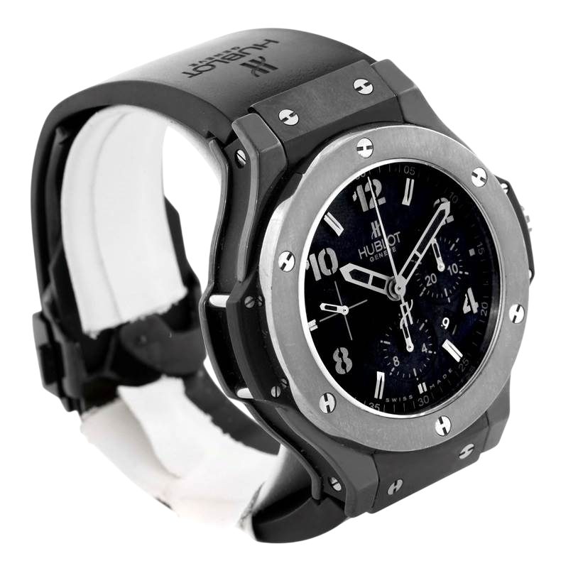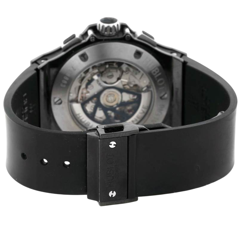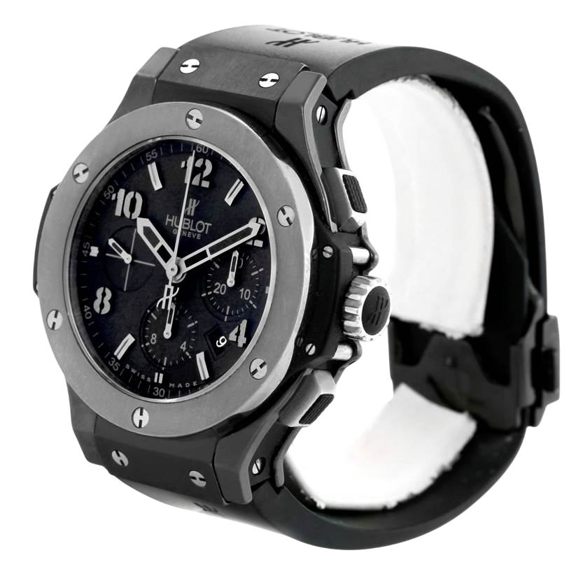 A 44mm Hublot Big Bang Ice Bang featuring a black ceramic case, black dial with grey accents, HUB4100 automatic chronograph movement, and a black rubber strap.