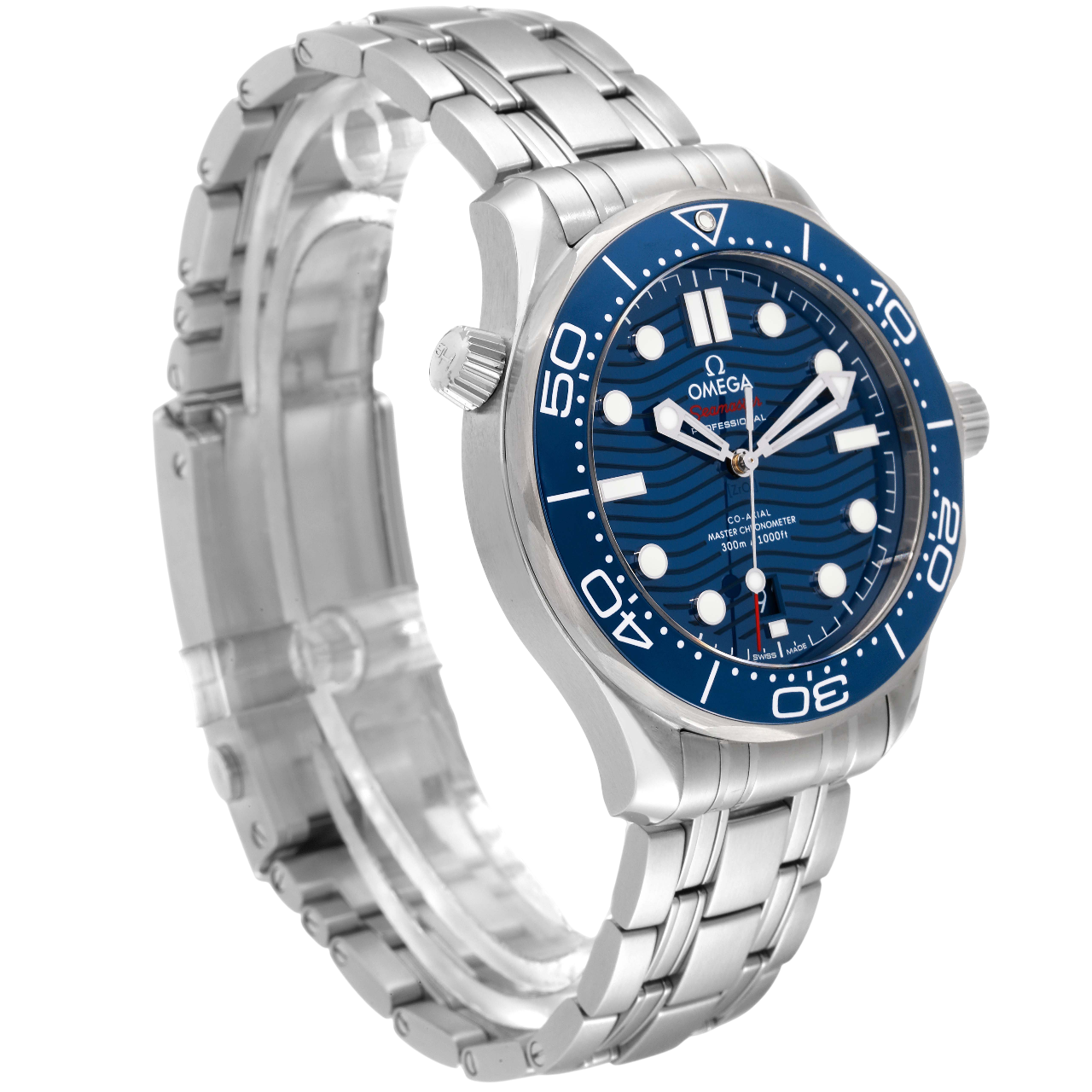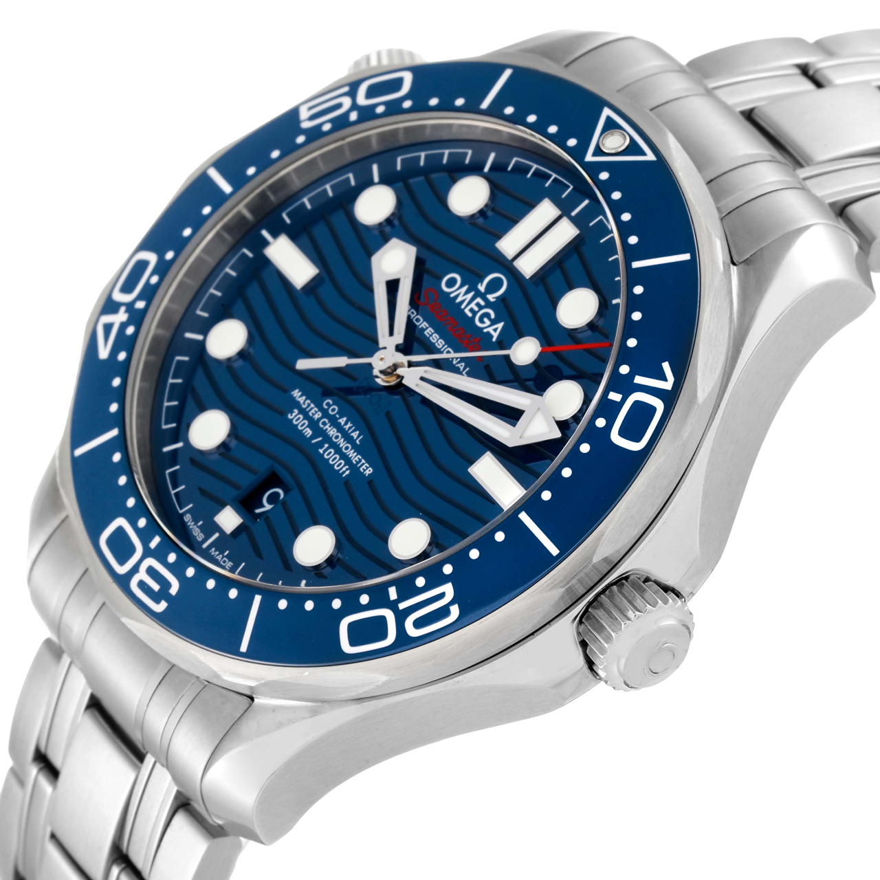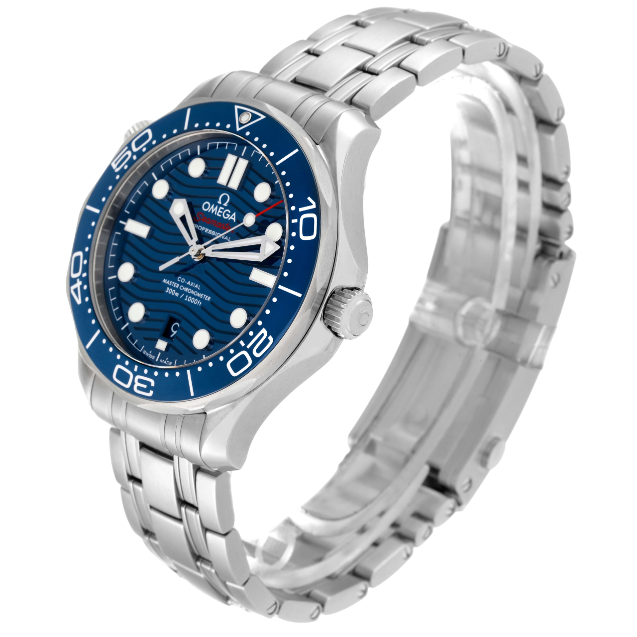 A 42mm Omega Seamaster Diver 300M featuring a stainless steel case, blue ceramic dial with wave pattern, blue ceramic bezel, Co-Axial Master Chronometer Caliber 8800, and 300m water resistance, paired with a stainless steel bracelet.