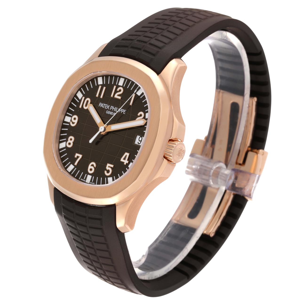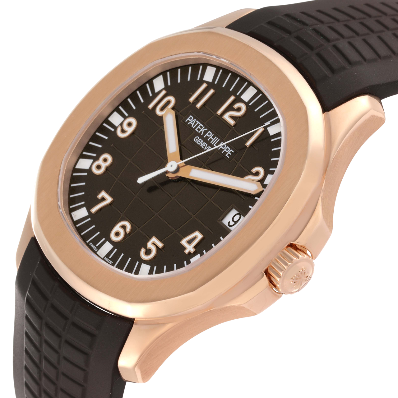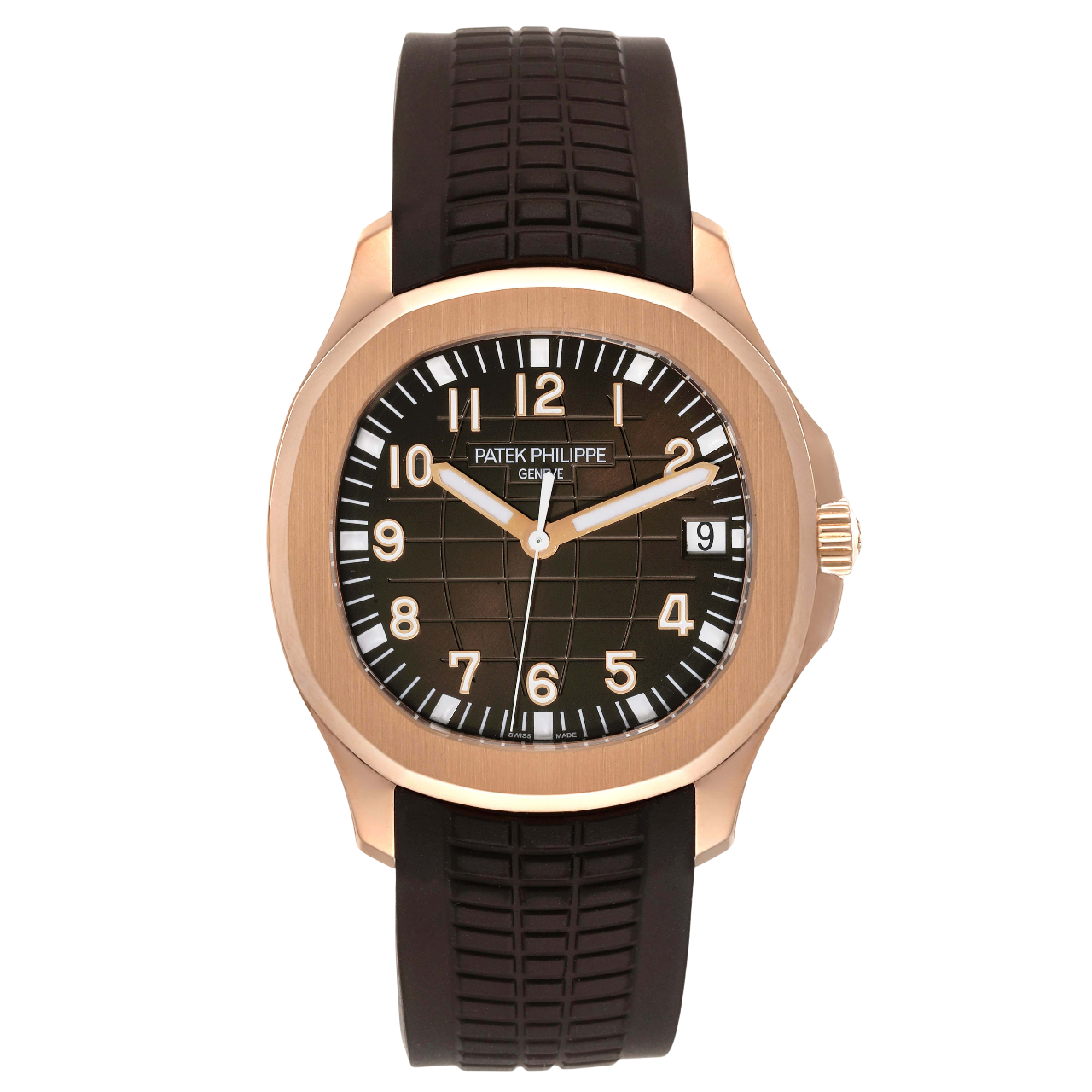 A 40mm rose gold Patek Philippe Aquanaut featuring a brown embossed dial, date function, and a matching brown tropical composite strap.