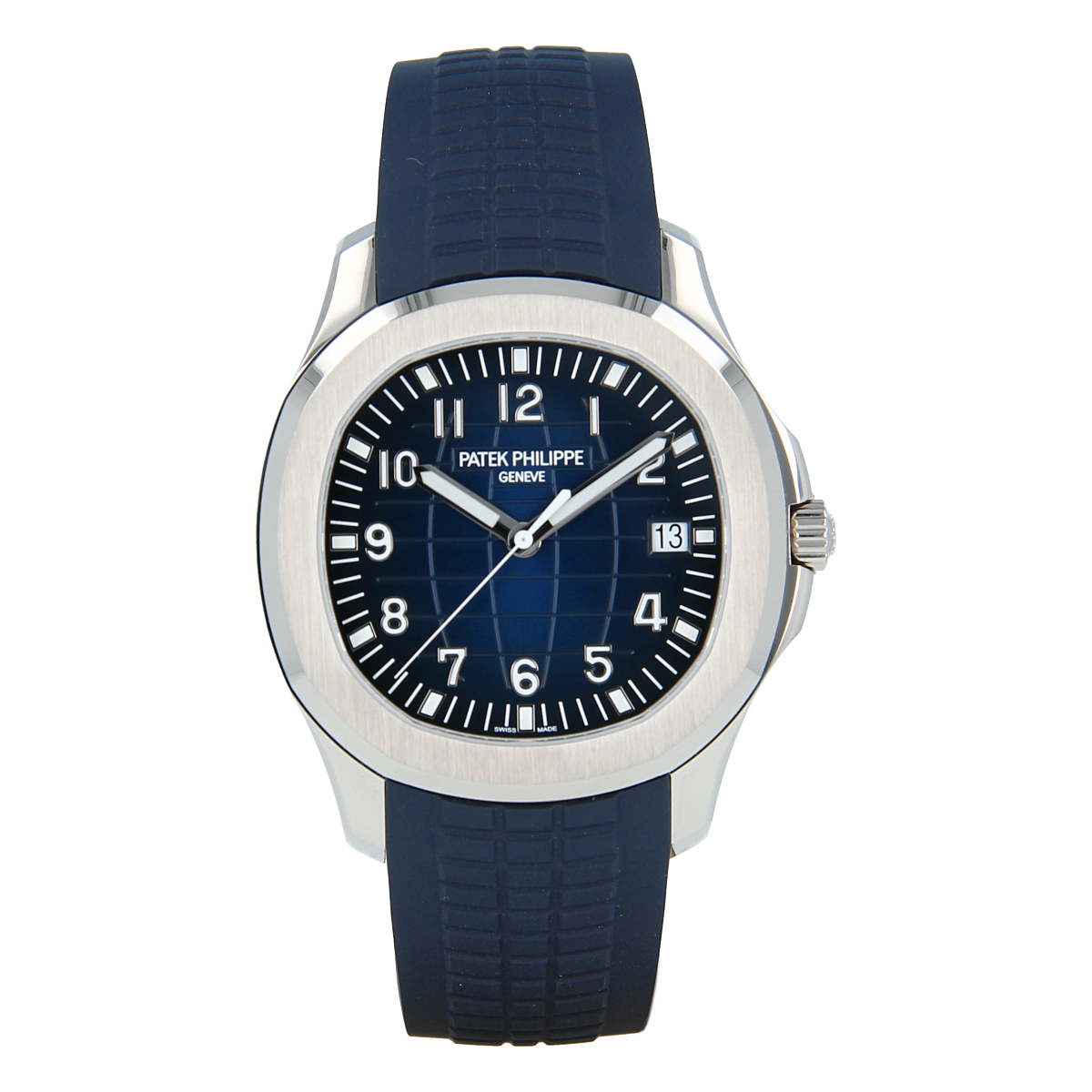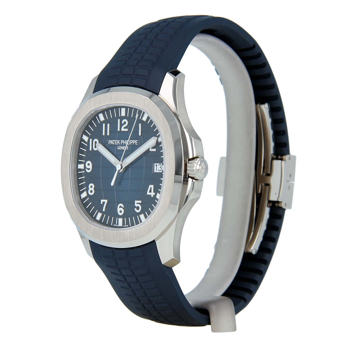A 42.2mm white gold Patek Philippe Aquanaut featuring a blue embossed dial, date function, and matching blue tropical composite strap.