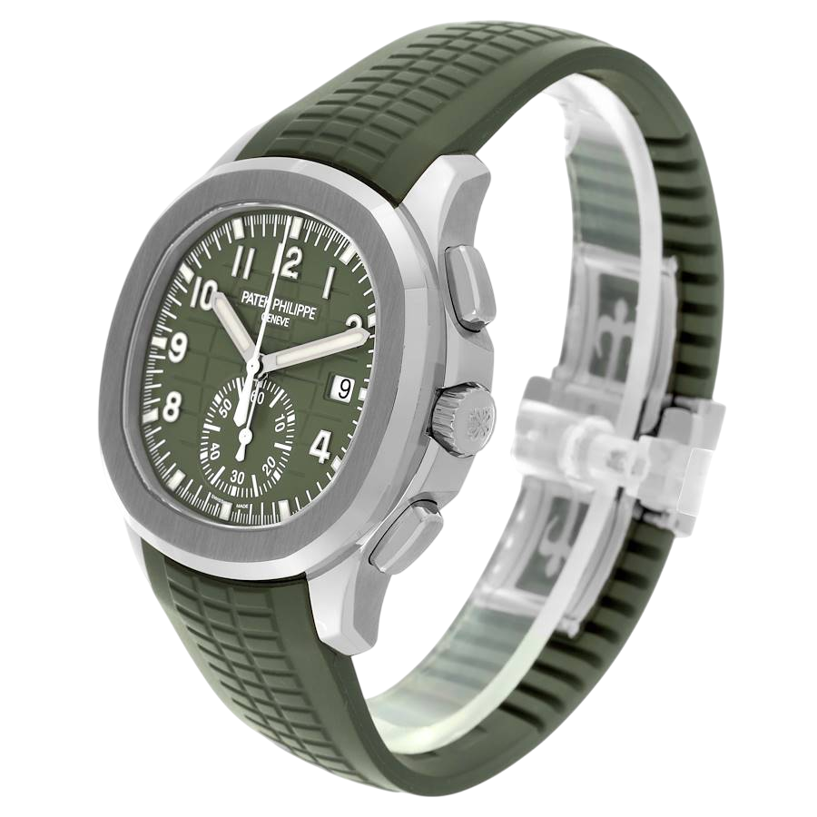 A 42.2mm white gold Patek Philippe Aquanaut featuring a khaki green embossed dial, chronograph, date function, and matching khaki green tropical composite strap.
