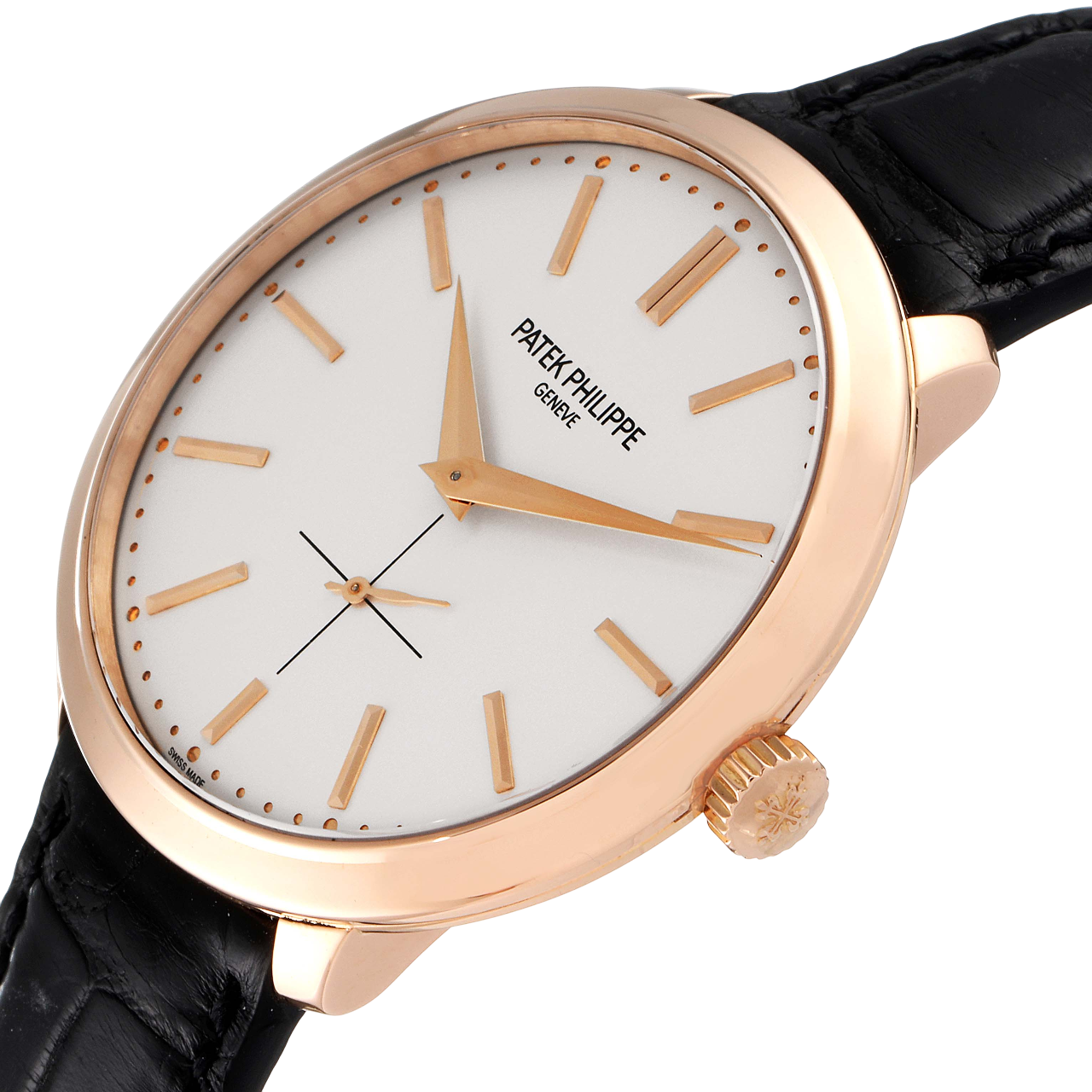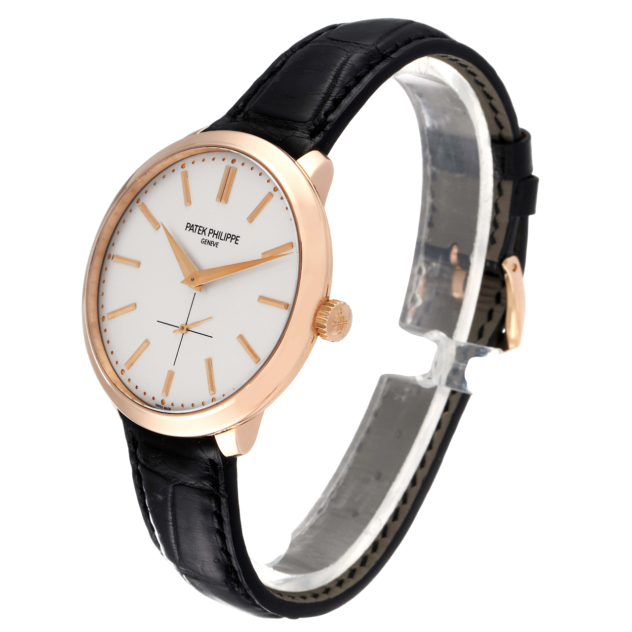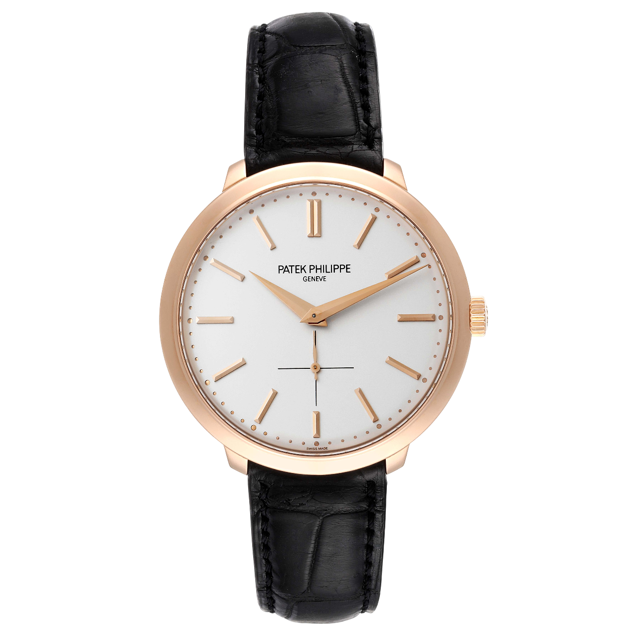 A 38mm rose gold Patek Philippe Calatrava with an ivory lacquered dial, manual winding movement, and brown alligator leather strap for classic sophistication.