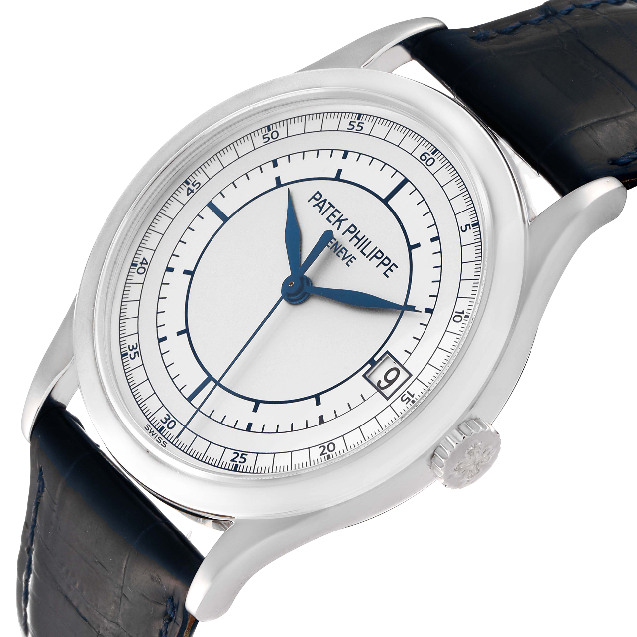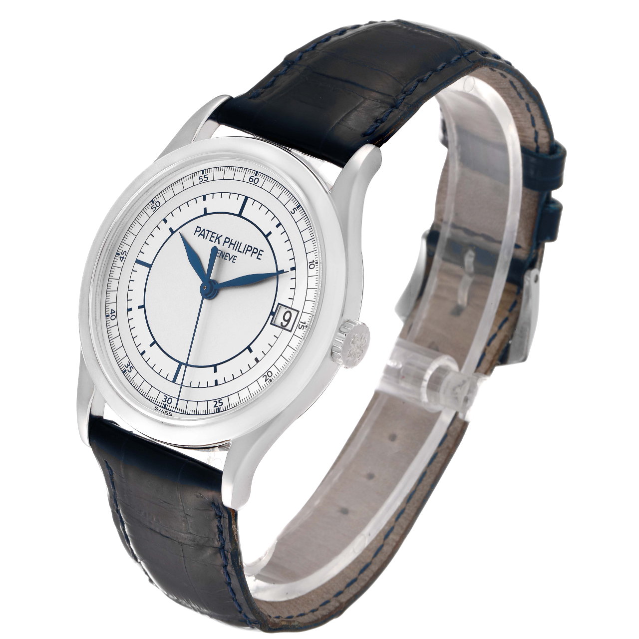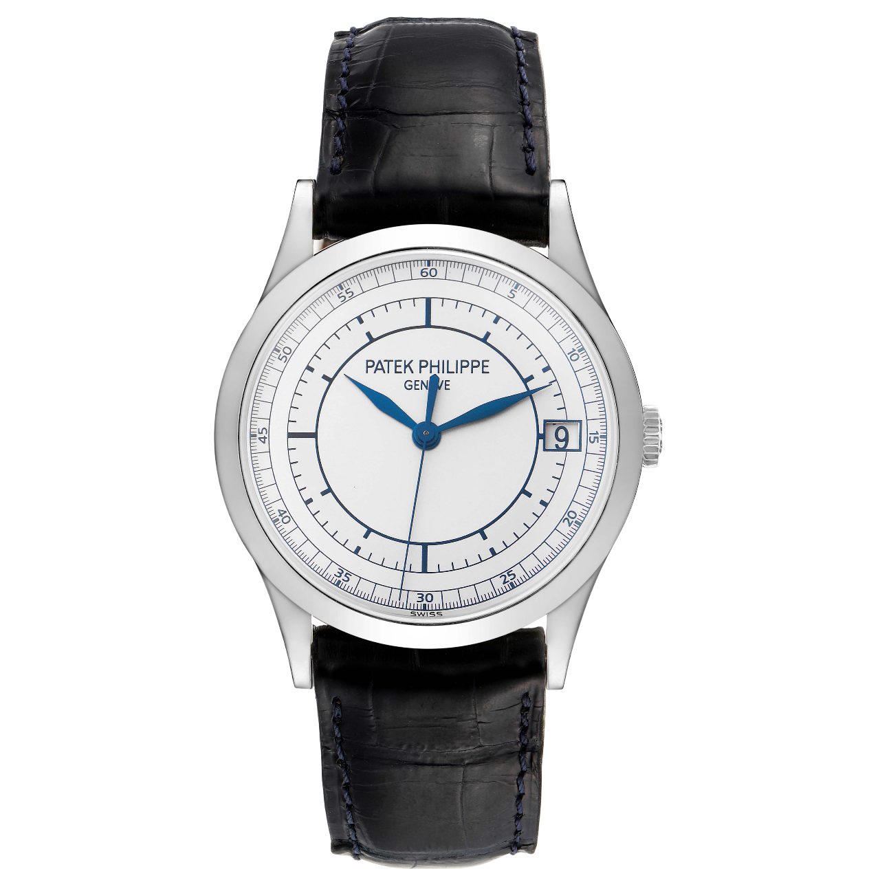 A 38mm white gold Patek Philippe Calatrava featuring a silver sector dial, automatic movement, and elegant black alligator leather strap.