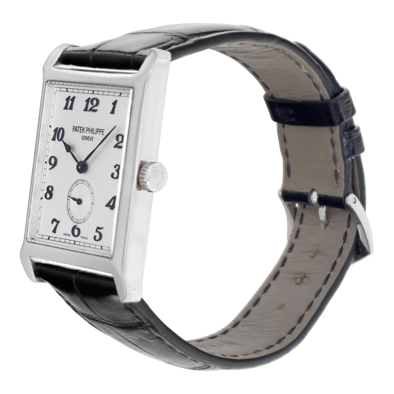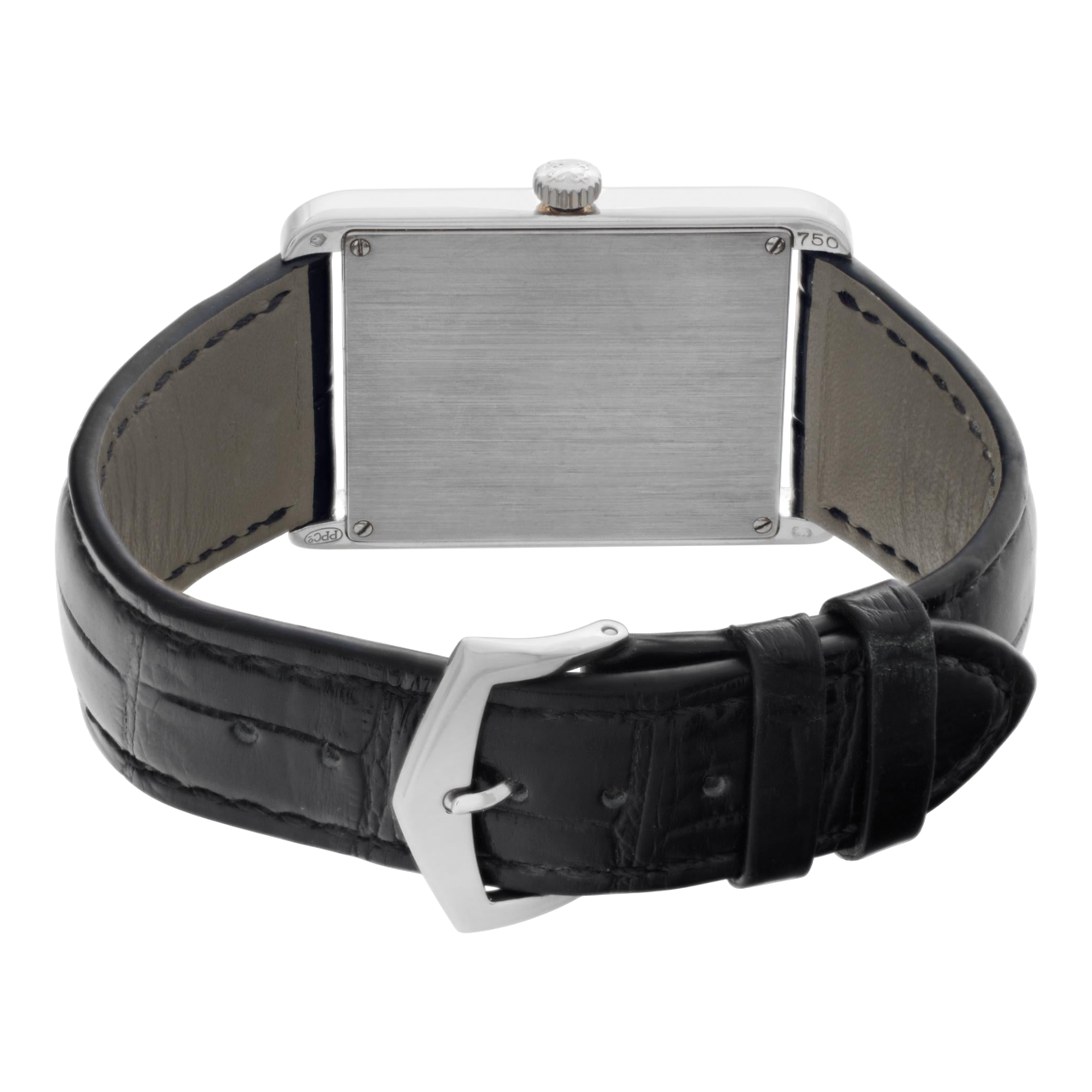 A 30mm x 38mm 18K white gold rectangular watch with a silver sunburst dial, manual movement, and elegant black leather strap, offering classic luxury.