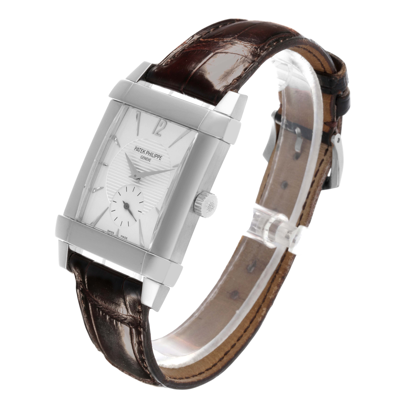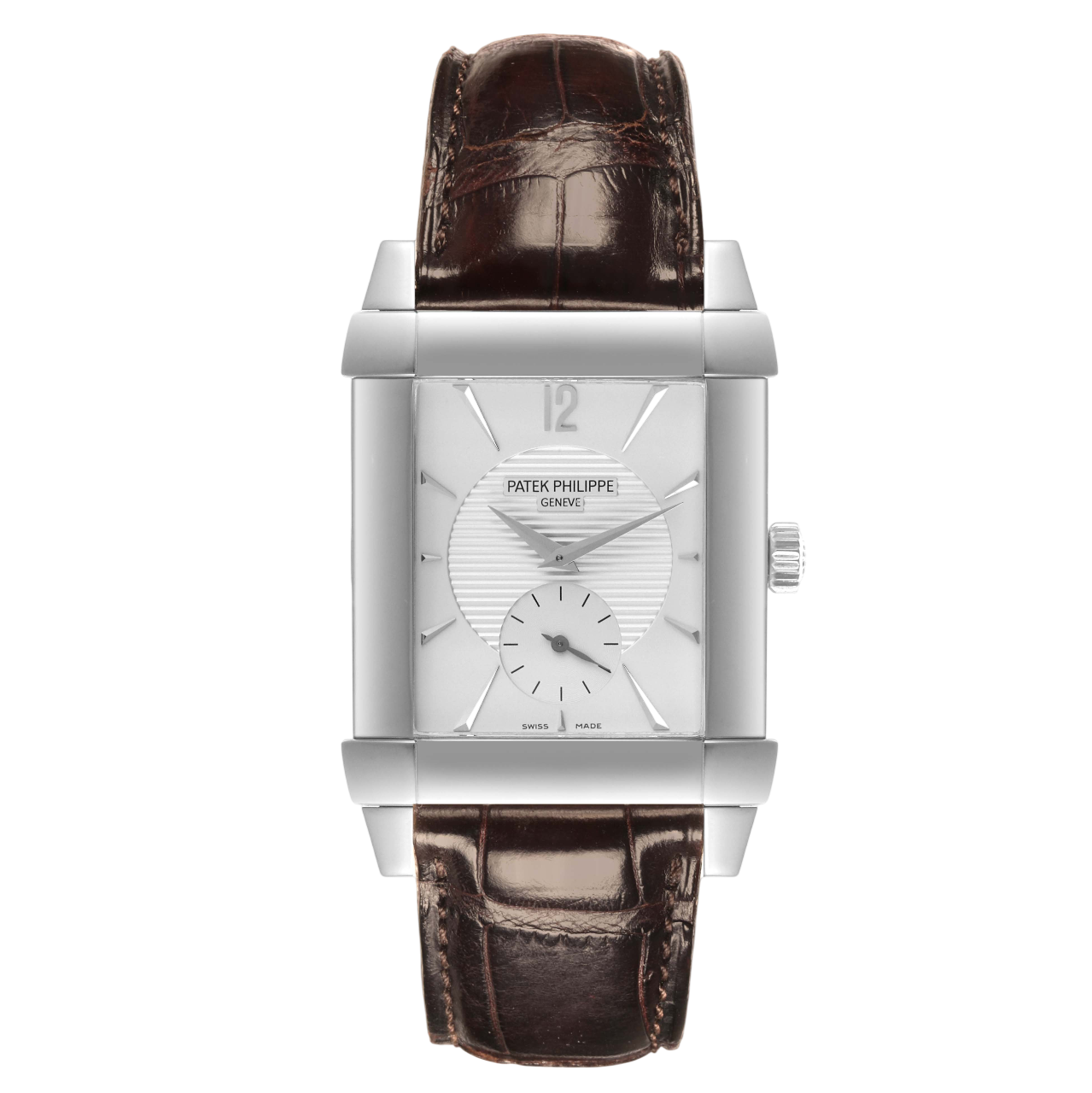 A 30mm white gold Patek Philippe Gondolo with a silvered dial, blue Breguet numerals, manual winding movement, and brown alligator leather strap.