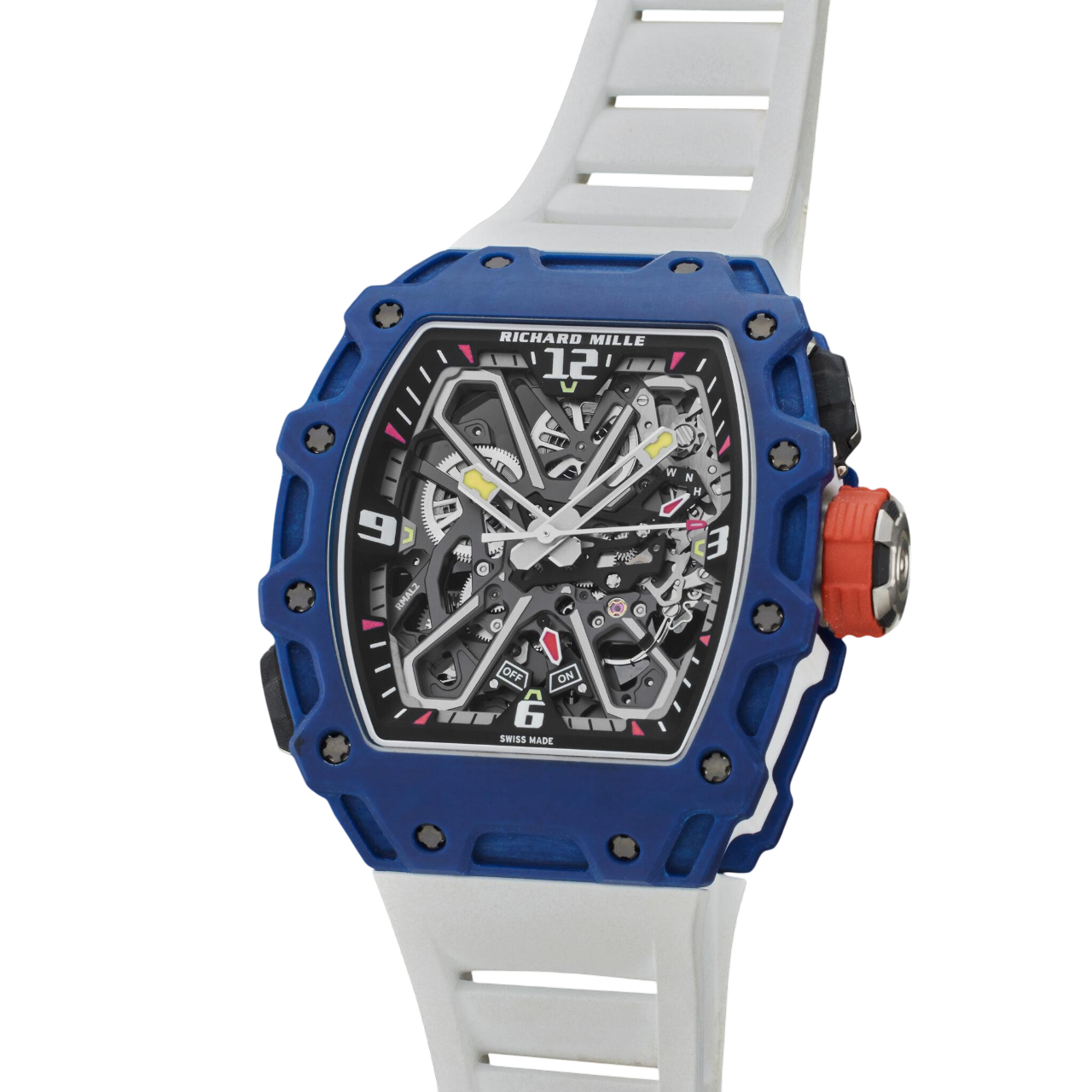 The Richard Mille RM 35-03 “Rafael Nadal” features a 43mm blue Quartz TPT® case, skeletonized dial, patented butterfly rotor mechanism, and a white rubber strap with a titanium clasp.